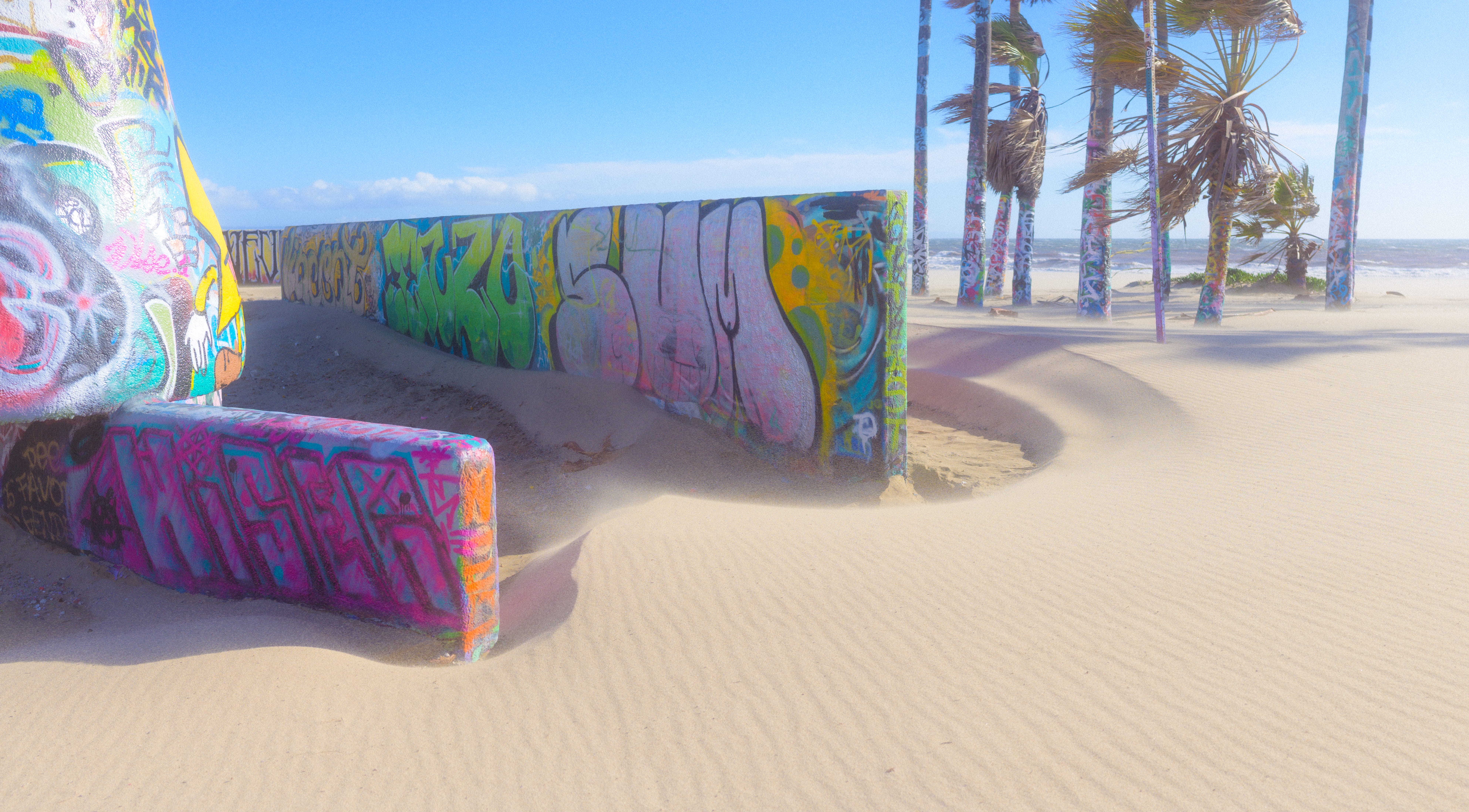 Below the towering slopes of San Jacinto, wind farms catch each gasp of air coming through Banning Pass. Sand drifts over the road into Palm Springs and keeps tempo with the farm’s array of blinking red warning lights.