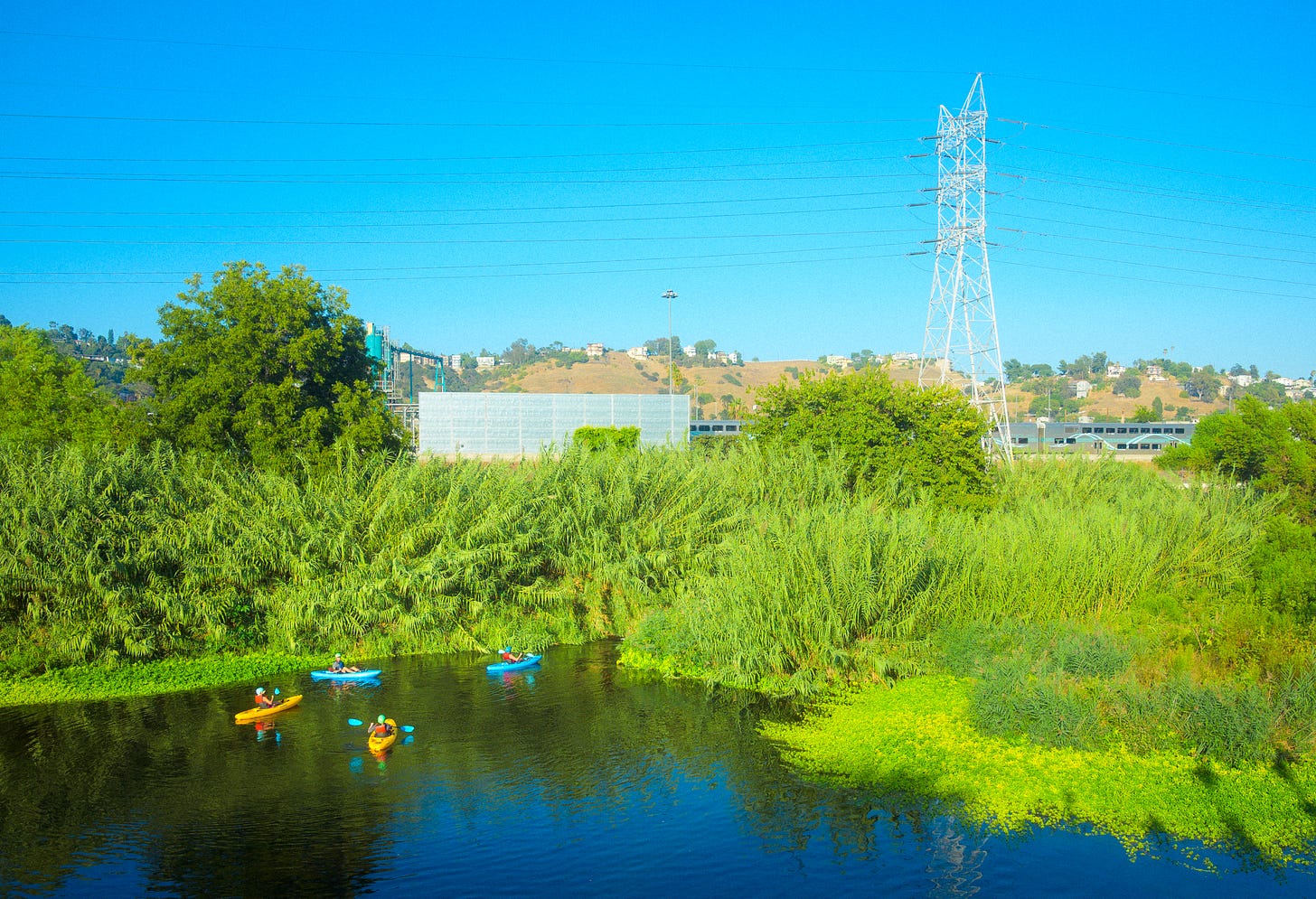 Intrepid kayakers ford rapids in the Los Angeles River near Frogtown [a vestigial placename]. It is a calm September. Mostly-dry and steady flow. Does the rental business’s checkbook ebb with the region’s sporadic rain?